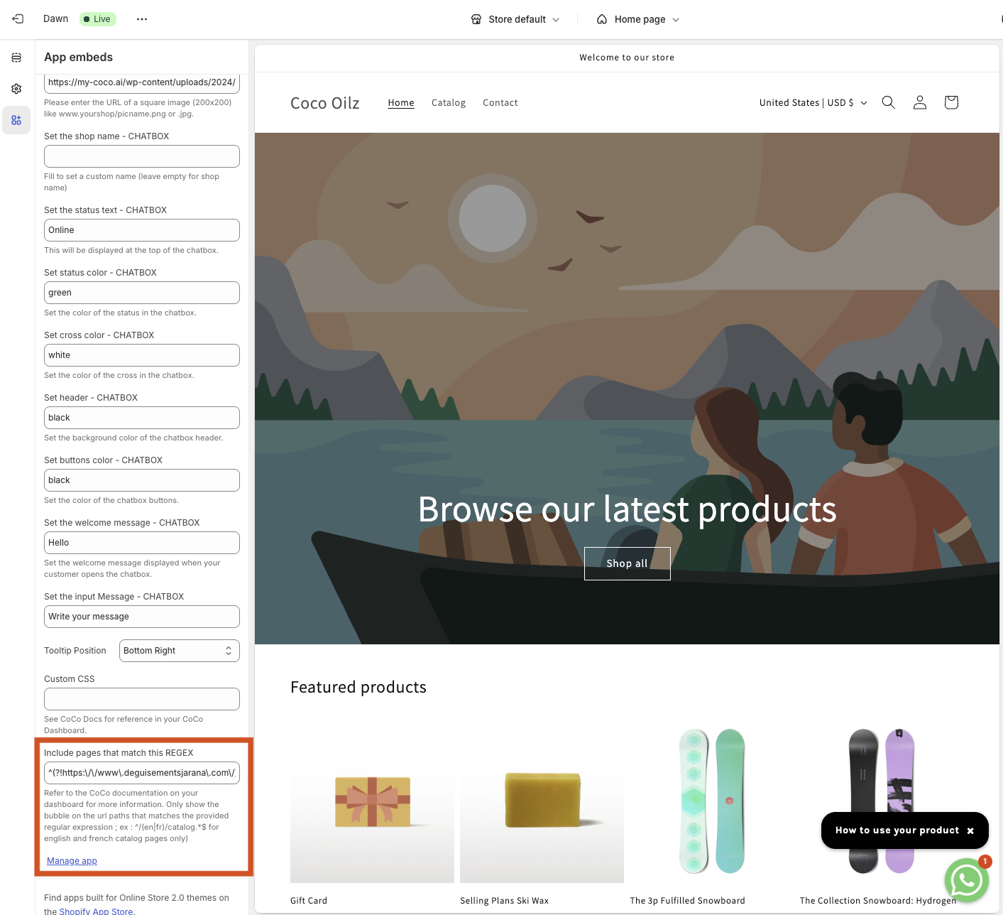 Ensuite lancez CoCo, allez dans la personnalisation de la bulle dans votre thème Shopify, descendez jusqu'au bas des champs de configuration et collez l'information dans le champ filtre REGEX / page.