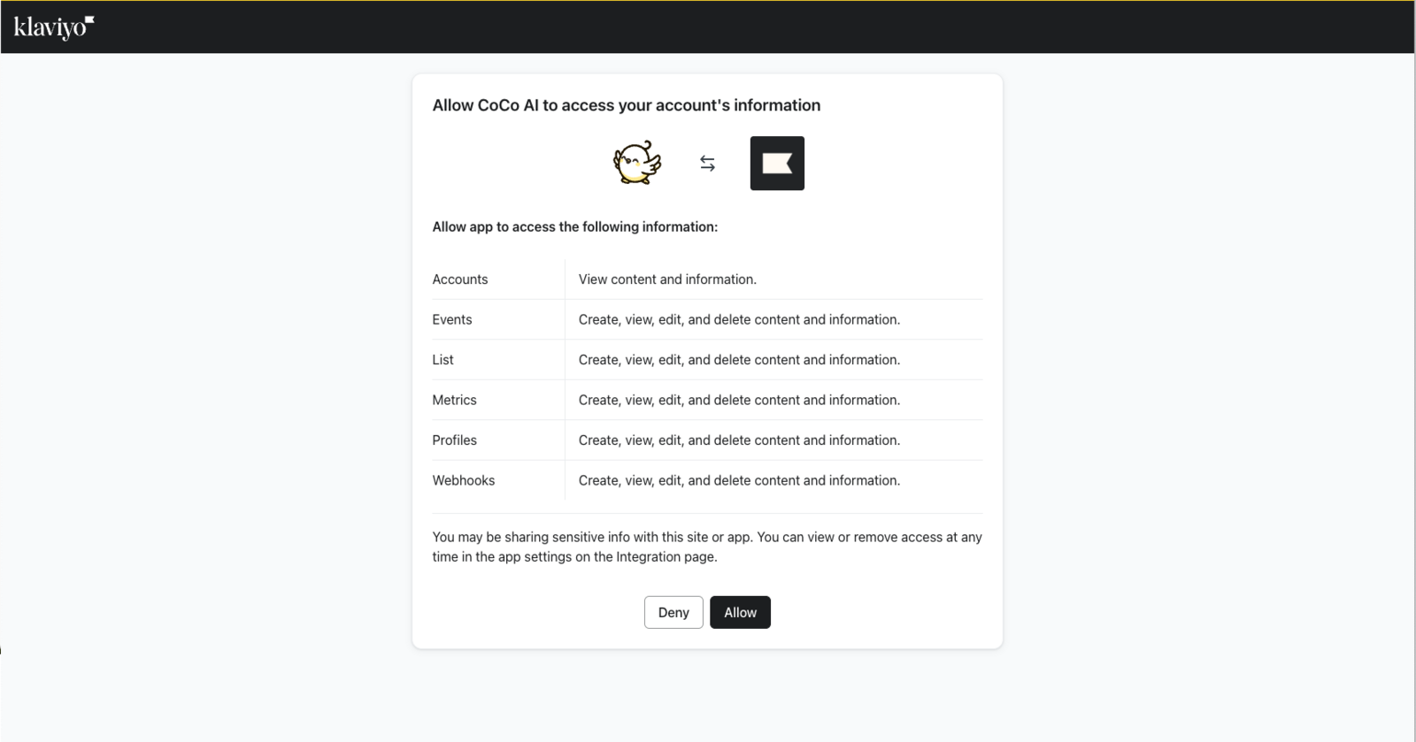 Follow the on-screen prompts in Klaviyo to grant Coco AI the necessary permissions and select Allow.